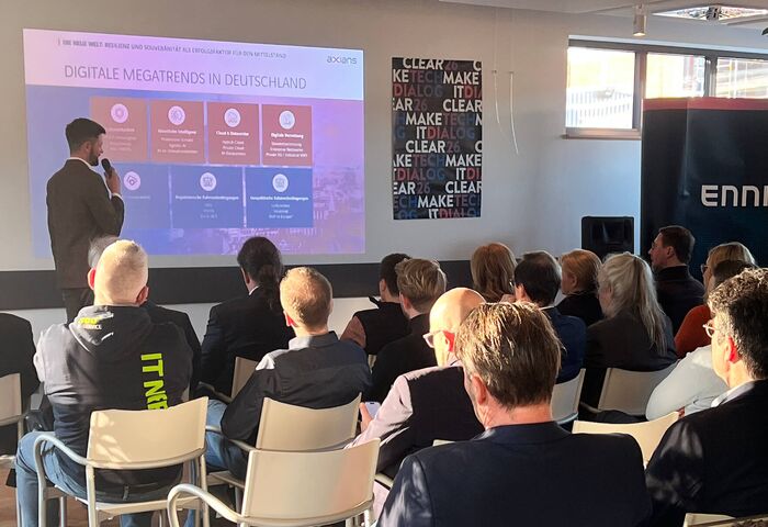 Zum TechDIALOG26 luden wir Expertinnen und Experten aus unterschiedlichsten Branchen sowie starke Partner auf den Campus der ennit ein, um die zentralen Zukunftsthemen des Mittelstands zu beleuchten. Greifbar und praxisnah. Im Mittelpunkt standen Resilienz, unternehmerische Souveränität und IT‑Sicherheit als entscheidende Erfolgsfaktoren in einer zunehmend digitalen Welt. Kompetent und inspirierend präsentiert und mit klarer Orientierung für Entscheiderinnen und Entscheider, die ihr Unternehmen zukunftsfest aufstellen wollen.